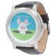 Um belo coelho da Páscoa cutucando sua cabeça, fez um buraco com o texto "Felz pascoa" flutuando acima.