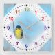 Pássaro amarelo agarra um galho vertical. A face branca do relógio tem uma vinheta de diamante no centro, permitindo que a imagem do pássaro apareça como se estivesse dentro da armação branca. Numerais são cores arco-íris (12 sendo amarelo como o pássaro). Os minutos são marcados com pequenos algarismos à volta da borda externa.