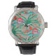 Ondas azuis de Aqua do oceano rodeiam o Flamingo Rosa sob as Palmeiras verdes na praia arenosa nesta imagem de tecido de tecido natural de Burlap. Este padrão de Palmeira tropical é um impressão de verão muito colorido e tem uma textura de falso pedaço.
