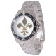 O relógio deste homem apresenta uma fria de folhas preta e dourada para ir com o seu estilo elegante. O Fleur-de-lis é um símbolo religioso que representa a Santa Trindade. O Fleur-de-lis tem muitas interpretações associadas à conversão da monarquia francesa à religião cristã e às bençãos da Virgem Maria.