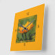 O Calendário Laranja floresce. Um quadro de dupla linha com quadrados cortados nos cantos assume a cor do fundo escolhido (padrão laranja). Altere a imagem e/ou altere a cor de fundo para coordenar com ela. Quatro grandes números do relógio: 12, 3, 6, 9 estão em preto.