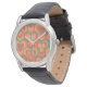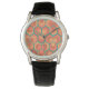 Este relógio tem um design geométrico de hexágonos em conjuntos de três, que se parecem com flores em ouro, laranja e vermelho num campo de chá.