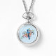 Um pássaro azul rodeado por flores de primavera cor rosa, púrpura e pêssego colorido colorido contra um pano de fundo azul claro.
