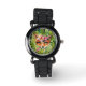Este é um rosto de raposa-de-laranja-aquática fox em uma coroa de flores, espiando folhas tropicais verdes.