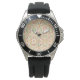 Front view of a wristwatch featuring a colorful floral-patterned face, black bezel, and black rubber strap. Back view shows the stainless steel case and clasp.
