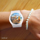 Assista com uma pintura colorida de um gatinho apreciando uma bebida na praia.