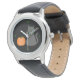 Este incrível relógio apresenta uma imagem de arte digital de um gato cinza giro com orelhas negras, nariz e boca e olhos verdes brilhantes. O gato está vestindo uma coleira verde com um charme brilhante de gema laranja em ouro. O gato está sentado ao lado de uma abóbora laranja.