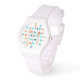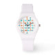 Este relógio tem um design moderno do século médio de uma grade em linhas pretas com círculos laranja e lacrimogêneo e diamantes.
