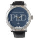 Um presente de relógio para um formando de doutorado com um esquema de cor azul e branca. Mostra o grau, o nome e o ano. Simplesmente personalize este relógio, adicione-o ao seu carrinho, e dê-lhes uma atenção especial a esta grande conquista, a chamada Design de férias de PhD Azul | ©Melissa Patton - Designer