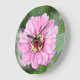 Foto de uma flor rosa, com flores em forma de estrela amarela no centro. A face do relógio tem números roxos.