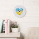 Belo design de relógio de parede inspirado no espírito resiliente das pessoas da Ucrânia, com coração aquoso na Ucrânia cores de azul e amarelo com uma citação inspiradora de Kahlil Gibraltar. Fundo de cinza leve com a face branca do relógio