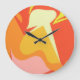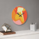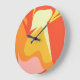 This clock features an abstract composition inspired by otherworldly forms and celestial landscapes. Vivid orange and radiant yellow interact with cosmic shapes, creating a striking visual narrative that suggests alien worlds and futuristic imagination — a functional artwork that brings adventure to time itself.