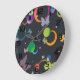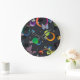 keep track of time with a piece of functional art using this wall clock featuring a bold contemporary nature pattern and multi-color butterfly print. the vibrant neon rings and floating spheres create a dynamic visual on the clock face, making it a perfect centerpiece for a kitchen, office, or bedroom. this modern pop aesthetic timepiece combines practical utility with a unique artistic flair that complements any contemporary interior design.