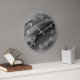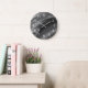 Este relógio monocromático redondo com algarismos brancos apresenta um abstrato design em tons de cinza.