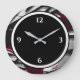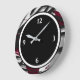 O relógio moderno apresenta um design abstrato artístico numa paleta de cores arrojada, preta e branca. Um simples design com números brancos sobre um fundo preto com uma borda cor de vinho borrifado com elementos de design artísticos abstratos.