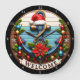 Esta é uma design gráfica animada, com estrutura circular, com um tema natalício náutico. O elemento central é uma âncora grande, azul e vermelha, decorada com um chapéu vermelho festivo de Santa e uma poinsettia. A âncora é colocada sobre um fundo de tábuas de madeira rústicas e está rodeada por pinheiros verdes e luxuosos ornamentos de férias em vermelho, azul e ouro. Uma faixa na parte inferior da imagem diz "BEM-VINDO". A cena inteira está fechada em uma armação circular de madeira, dando-lhe uma sensação confortável de feriado costeiro.