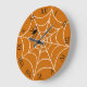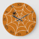 Para o Halloween uma aranha negra rastejando numa teia branca com um rosto laranja num relógio de parede com marcadores numéricos romanos de hora em preto este não é um truque é um presente