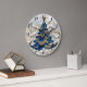 Um relógio bem trabalhado captura a essência do Natal, apresentando uma árvore festiva enfeitada com ornamentos azuis e dourados.