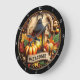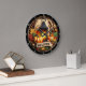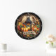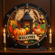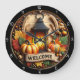 This image displays a round wall clock with a rich, autumnal harvest theme. The clock face features a rustic wooden plank background adorned with a central, antique-style lantern that glows warmly from within. Surrounding the lantern is a bountiful arrangement of fall elements: vibrant orange and green striped pumpkins, gourds, acorns, red berries, and an assortment of autumn leaves in shades of red, orange, and yellow. Bundles of wheat stalks frame the top of the scene. A banner across the bottom reads "WELCOME". The clock has a dark, possibly black, outer rim with white numbers from 1 to 12.