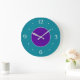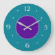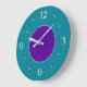 Um relógio simples com borda azul-turquesa e centro de círculo roxo. Este design de relógio colorido tem numerais e ponteiros prateados para combinar. Personalizável e disponível em formas redondas e quadradas.