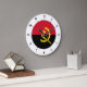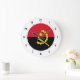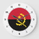 Design com pavilhão da República de Angola; bandeira vermelha e negra com símbolo amarelo de machete cruzado e roda de cobre com uma estrela de ouro