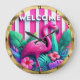 Este relógio de parede circular apresenta um flamingo rosa vibrante em pé entre uma folhagem verde-escura e azul-tropical com flores rosa florescentes. O plano de fundo apresenta faixas verticais em negrito em tons alternados de rosa e branco. A palavra "BEM-VINDO" aparece de forma destacada em letras brancas tridimensionais na parte superior da face do relógio. O relógio está embutido em um ouro, armado.
