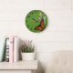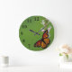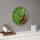 A borboleta de monarca empoleirou-se em uma flor da estrela de ardência sobre um fundo verde. As horas de 7 a 12 têm os números a equilibrar com a borboleta.