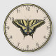 Este design apresenta marcas de escala na face do relógio. Esta obra de arte original é de uma borboleta preto-e-amarela do Swallowtail Western, uma das maiores borboletas mais bonitas do sudoeste. O desenho é baseado em fotografias que a artista tirou em seu próprio jardim amigável à borboleta na Arizona. Sobre um fundo de bege com fezes de vermelho e azul.