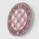 Este relógio de parede glamouroso e feminino apresenta um design cor-de-rosa brilhante e escuro. A parte dentro apresenta um padrão tufado cor-de-rosa acentuado com diamantes. A poção externa apresenta um design cintilante cor-de-rosa escuro e falso com números brancos. Um quadro de folha de alumínio rosa borda os números e a parte de dentro.