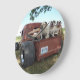 Três buldogues bonitos prontos para ir para um passeio na parte de trás de uma haste do rato.