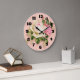 Um relógio com um buquê de rosa floral com flores brancas e cor-de-rosa. O fundo é rosa com um padrão floral. Bonito e elegante design.
