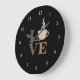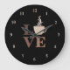 Este é o relógio perfeito para pendurar em sua casa, escritório ou escola. Feita especialmente para amantes do café, esta design apresenta um fundo preto com tipografia do "Amor" escrita em bege e e uma xícara de café quente integrada à design. A xícara de café tem ascensão a vapor dele. Adicione seu próprio texto, fotos ao design.