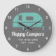 Um relógio de parede alegre, perfeito para o seu campista ou RV. Mostrada com uma cinza de carvão e design de camper colorida com a frase "Feliz Campers". Personalize seu nome de família para torná-lo de um tipo. A cor de fundo também pode ser alterada para corresponder à decoração e preferências.
