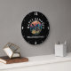 Este relógio com um design de fundo preto tem uma tenda e pinheiros. Em volta do gráfico em branco está "Happy Campers" e abaixo que você pode personalizar o relógio com seu nome de família. Uma edição de excelente para sua aventura de acampamento no exterior.