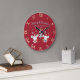Este relógio festivo de natal apresenta um tema de inverno bonito sobre um fundo vermelho de burgundy. Uma imagem de dois ratinhos é ilustrada ao lado de uma árvore de Natal, sob luzes coloridas e flocos de neve. Uma saudação de "Feliz Natal" é impressa no topo, seguida de um nome de família de amostra. Você pode personalizar o relógio para incluir seu próprio nome personalizado ou texto. As horas são impressas em um design numérico ouro romano.
