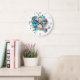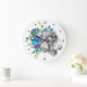 Preso neste arranjo de flores azuis e roxas é uma linda imagem de aquarela de um cachorro de cinza. Números de cinzas escuras e marcadores em forma de diamante ao redor do perímetro tornam este relógio fácil de ler. Tudo é colocado sobre um fundo branco.