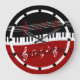 Um design legal e atraente da música do piano que caracteriza chaves do piano em um movimento de ondulação no centro com vermelho, contagens preto e branco das notas musicais acima e abaixo nas cores alternas.