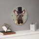 Ótima ilustração de um filhote de cachorrinho francês, ao estilo do hipster, vestindo o vidro dos olhos, o chapéu de cima e a gravata de arco em fundo de cinza. Concebido por Maryline Cazenave.