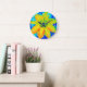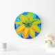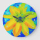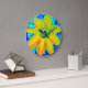 Uma bela flor colorida de clematis, amarela, laranja e verde, contra um fundo vibrante de aqua e azul adornam este relógio floral de acrílico. Esta imagem é digitalmente manipulada pela fotografia original JLW_PHOTOGRAPHY.