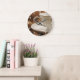 Coffee theme kitchen wall clocks with photo of an antique coffee cup and saucer on the clock face in this java themed wall decor clock design for a kitchen, family room or living room. Great gift for coffee or tea drinkers.