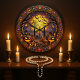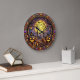Esta única face do relógio do Halloween apresenta uma cena assustadora com pistas brilhantes de jack-o-lanternas e túmulos arejados ao redor de uma porta escura e de ferro. Uma lua grande e brilhante de cheio ilumina a cena, com morcegos voando sobre ela e uma teia de aranha pendurada em uma árvore torcida. O próprio relógio é uma estrutura vibrante e ornamentado, adornada com joias coloridas e padrões intrincados. As mãos do relógio são pretas e apontam para números que também são colocados dentro de quadros soldados.