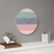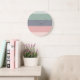 Um relógio de parede moderno com design de padrão em bloco em cores bonitas de verde, azul e rosa. Um estilo minimalista que seria uma adição encantadora a qualquer cozinha, quarto ou escritório em casa.