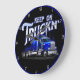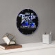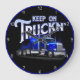 Este relógio de parede é um tributo vibrante ao estilo de vida do caminhoneiro. Apresenta um friccionador azul no seu centro, colocado sobre um fundo preto com silhuetas sutis de palmeiras e uma jante azul. A frase "MANTER EM CAMINHO" aparece corajosamente em letras metálicas prateadas e brancas, criando um design perfeito e dinâmico para qualquer entusiasta de caminhões.