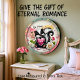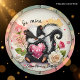 This charming circular wall clock showcases a whimsical watercolor-style illustration of an adorable baby skunk with large, expressive eyes. The skunk sits holding a sparkling pink heart featuring the embossed text "BE MINE" in white. The phrase "Be mine" is also written in a delicate black script font above the character. Surrounding the skunk are soft pink and white roses with green leaves, set against a background of artistic pastel splashes. The entire design is enclosed within a multi-colored decorative border featuring pink, teal, and gold tones. A clear clock face border displays black numbers from 1 to 12, with black clock hands centered over the main illustration.