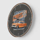 Esta é uma renderização de um carro clássico laranja americano com gráficos de estilo vintage em segundo plano para um olhar retrô.
