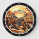 Esta é uma ilustração detalhada, ao estilo de vintage de uma moto marrom com sacos de sela estacionados numa vasta paisagem desértica. A cena é banhada à luz quente, ouro, de um sol calmo, que lança sombras longas sobre formações rochosas torrenciais e numerosos cactos. Uma bomba de gás antiquada e cartazes de madeira indicando várias rotas sugerem uma paragem numa longa viagem. A motocicleta parece estar a ser reparada, com peças dispersas no chão. A estética global evoca um sentido de liberdade, aventura e a clássica estrada livre americana.