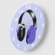 Um relógio de parede azul claro com algarismos brancos e uma ilustração digital de fones de ouvido azuis. Disponível em outras opções. Visite nossa Loja para mais Relógios de Parede e outros Acessórios Domésticos.