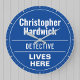 Estilo Comemorativo Divertido Presente em Parede na forma de Relógio de Parede para um Detetive da Polícia. Placa azul e branca. Edite a design para alterar o texto de acordo com o destinatário do presente.