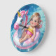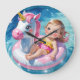 Uma menina bonita caminha gentilmente num flutuador de unicórnio rosa e branco, deslizando através de uma piscina de natação azul e cristalina.