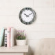 Um estilo rural e natural, onde a foto do latido velho do pinho encontra o centro branco da face do relógio com dígitos romanos. Um pulso de disparo de parede perfeito para algum estilo rústico da cabine ou da casa de campo. Ou simplesmente no escritório de uma pessoa loving da natureza.